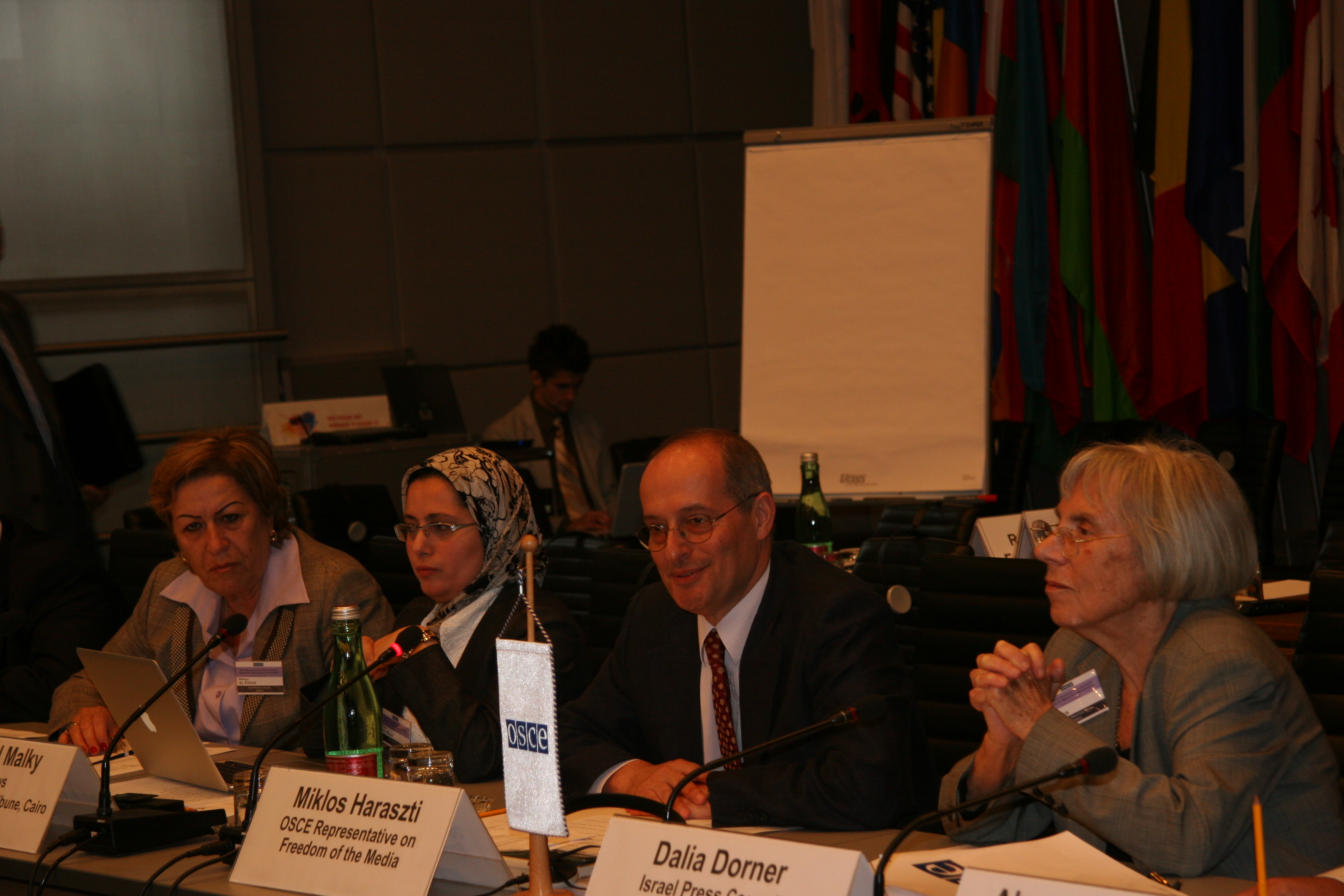 Miklos Haraszti (c), the OSCE Representative on Freedom of the Media, with Rania Al Malky (l) of the Egyptian Daily News, and Justice Dalia Dorner (r), President of the Israel Press Council, at a seminar on media self-regulation, Vienna, 19 June 2009.