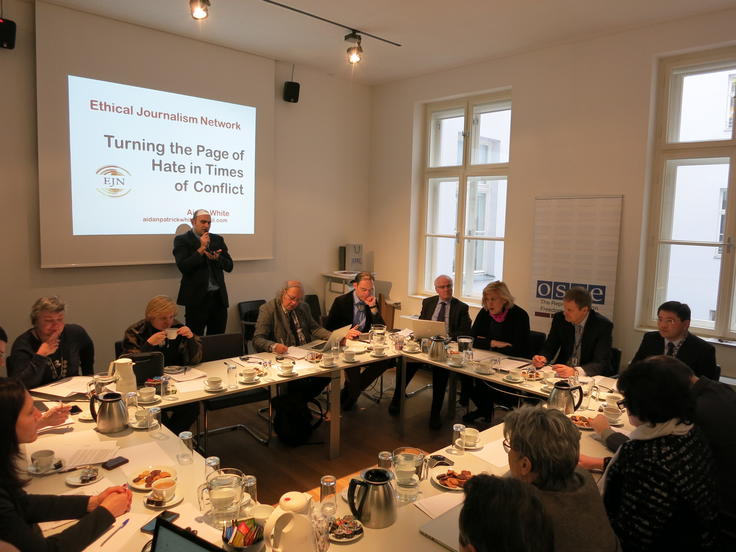 Participants at the a fifth roundtable discussion between the representatives of the Russian Union of Journalists (RUJ), Independent Media Trade Union of Ukraine (IMTUU), and the National Union of the Journalists of Ukraine (NUJU).