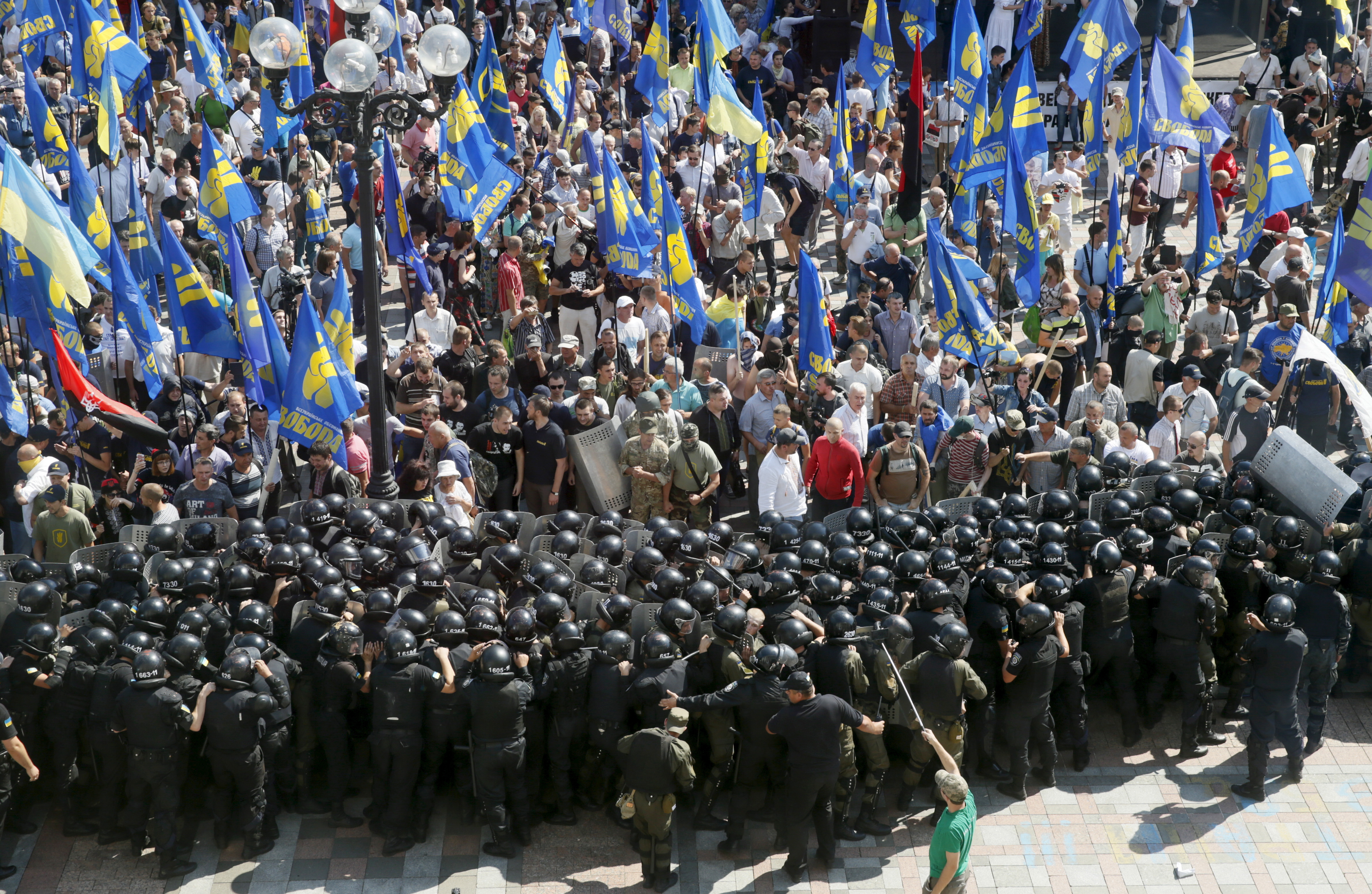 Demonstrators and police seen outside the parliament building in Kiev, Ukraine, August 31, 2015.