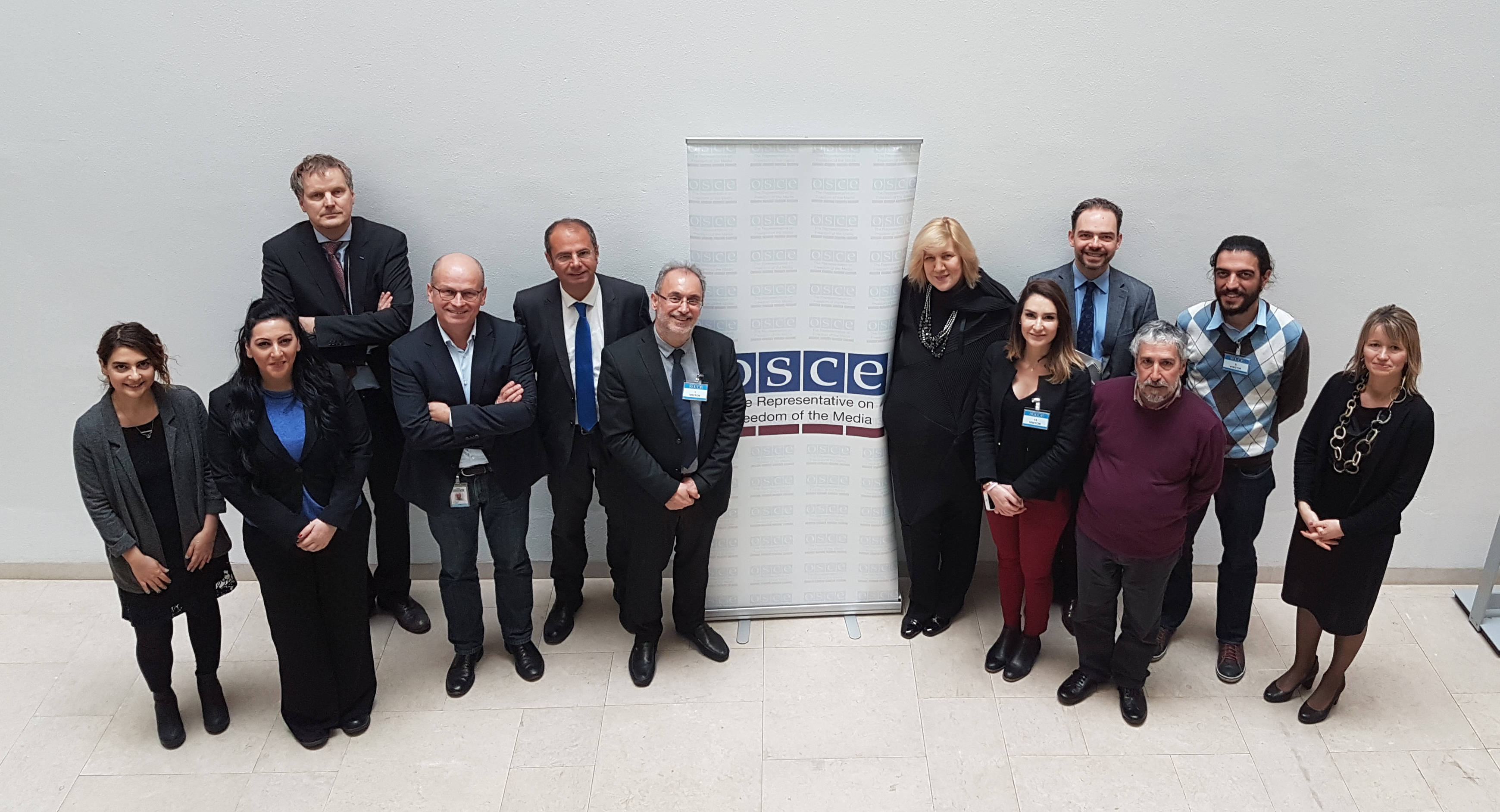 Cypriot journalists (from left to right) Gizem Özgeç, Sami Özuslu, Georgious Frangou, Esra Aygin, Christos Christophides and Andreas Riris, with Dunja Mijatović, OSCE Representative on Freedom of the Media and members of her Office, meeting in Vienna, 7 March 2017.