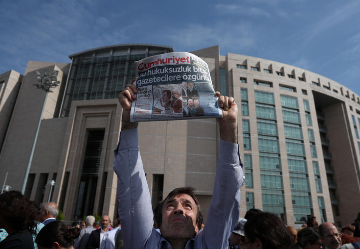 A press freedom activist holds a copy of the newspaper Cumhuriyet during a demonstration in solidarity with the jailed members of the newspaper Cumhuriyet outside the courthouse, in Istanbul, Turkey, September 25, 2017.