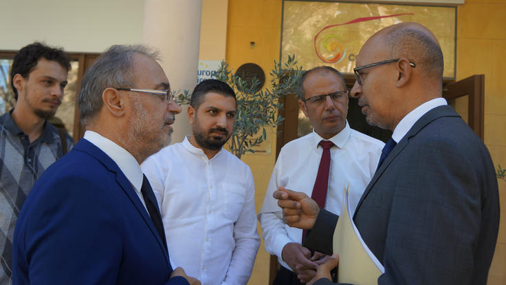 OSCE Representative on Freedom of the Media Harlem Désir meeting with George Frangos (l-r), Ali Kismir and Sami Özuslu, the heads of journalists' unions, Nicosia, 9 October 2017.