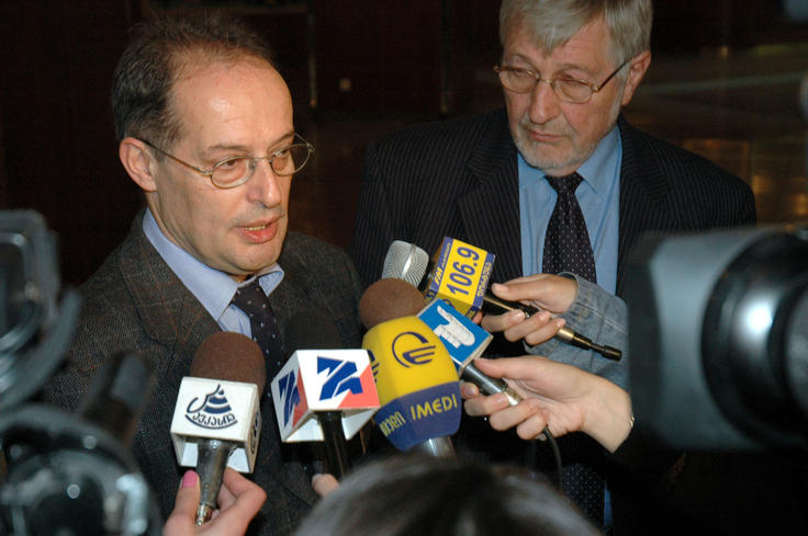Miklos Haraszti, the OSCE Representative on Freedom of the Media, speaks to journalists as Ambassador Roy Reeve looks on, in Tbilisi, 26 October 2004.