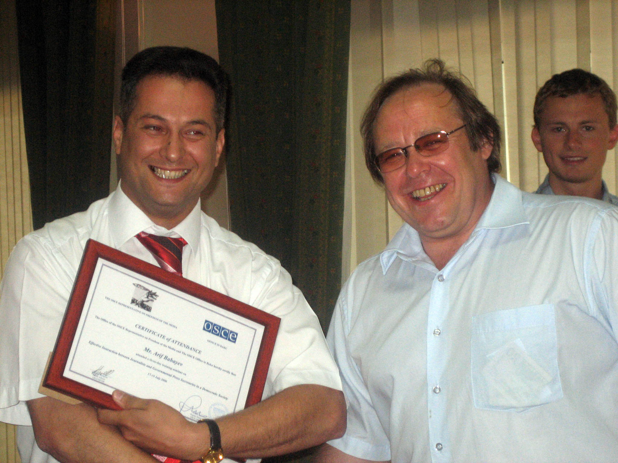 Arif Babayev (left) is congratulated by Alexander Boldyrev, Senior Advisor to the OSCE Representative on Freedom of the Media, after he completed a training course for government press secretaries and journalists in Baku, 19 July 2006.