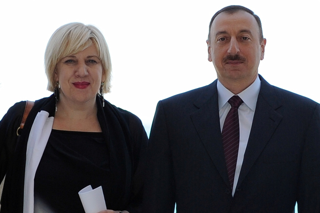 President of Azerbaijan Ilham Aliyev (r) poses for a photograph with OSCE Representative on Freedom of the Media Dunja Mijatović, after a meeting on media freedom in Azerbaijan, Baku, 11 May 2011.