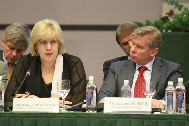 The OSCE Representative on Freedom of the Media, Dunja Mijatović (l), speaks at the opening session of the Conference on Safety of Journalists in the OSCE Region, alongside the OSCE Chairperson-in-Office, Lithuanian Foreign Minister Audronius Ažubalis, Vilnius, 7 June 2011.