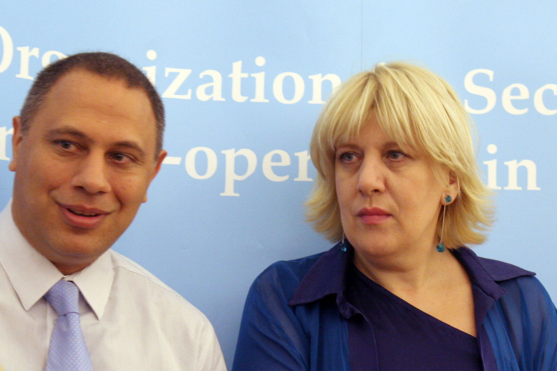 The OSCE Representative on Freedom of the Media Dunja Mijatović (right) and author Yaman Akdeniz of Istanbul Bilgi University at the presentation of a study on regulations affecting new media in the OSCE region, Vienna, 8 July 2011.