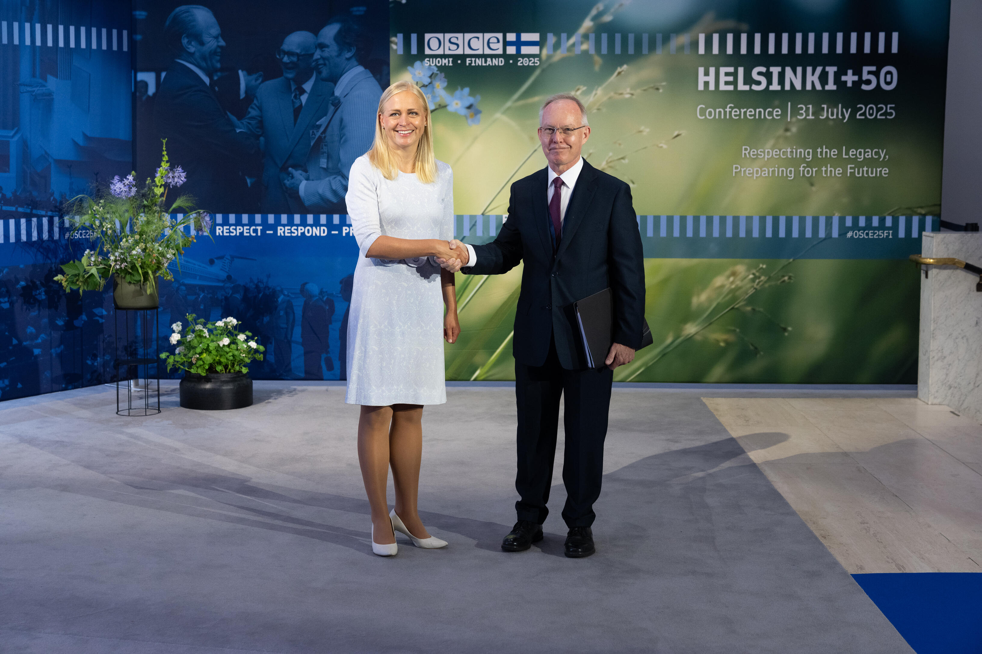 OSCE Representative on Freedom of the Media, Ambassador Jan Braathu, with Minister of Foreign Affairs of Finland, Elina Valtonen, shaking hands in front of a banner showing the logo of the Helsinki+50 Conference, smiling, with the Ambassador holding a folder with documents.