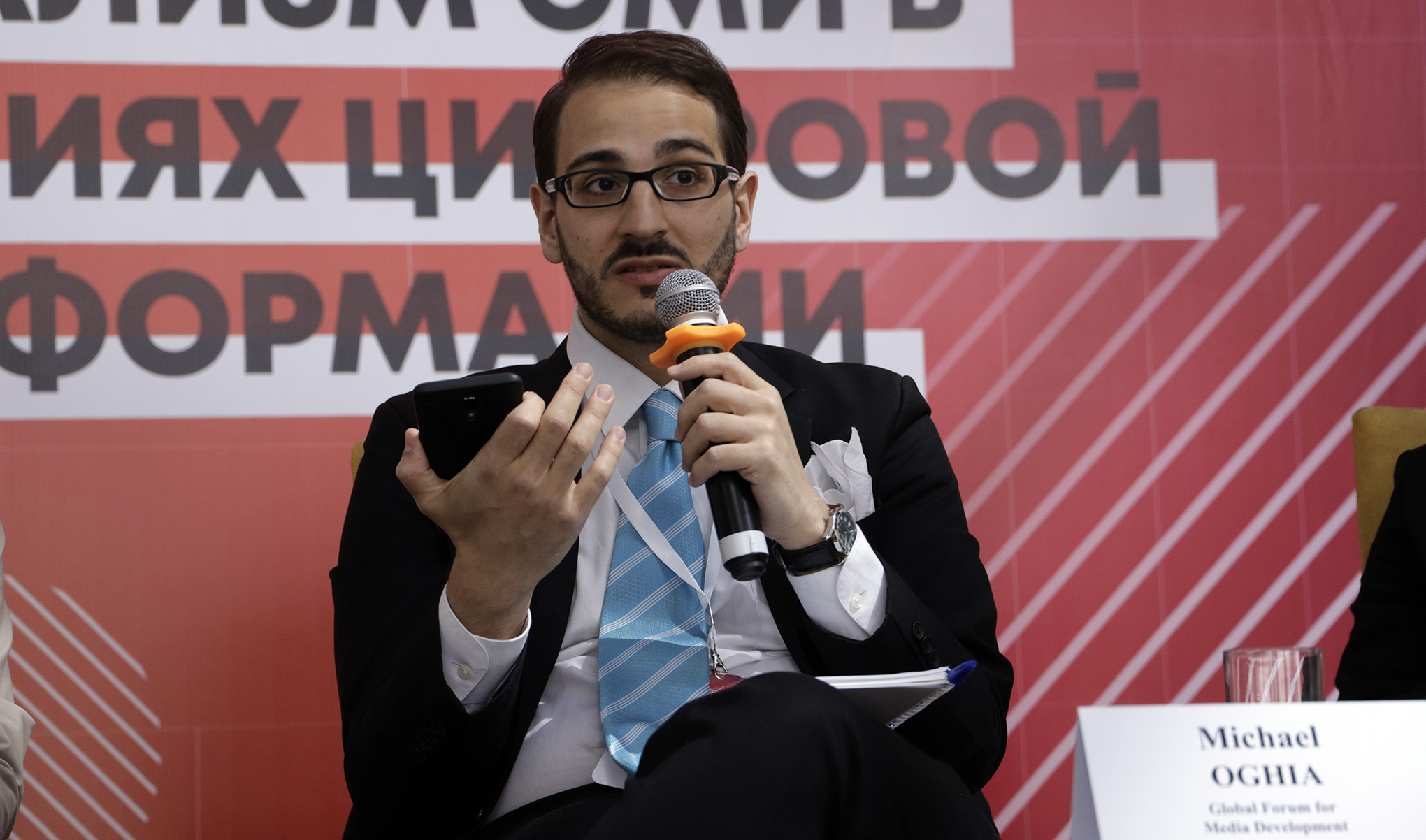 Michael Oghia, Advocacy & Engagement Manager, Global Forum for Media Development, speaking during the first session of the 21st Central Asia Media Conference, Bishkek, 17 July 2019. (Daniil Chatyrkulov)