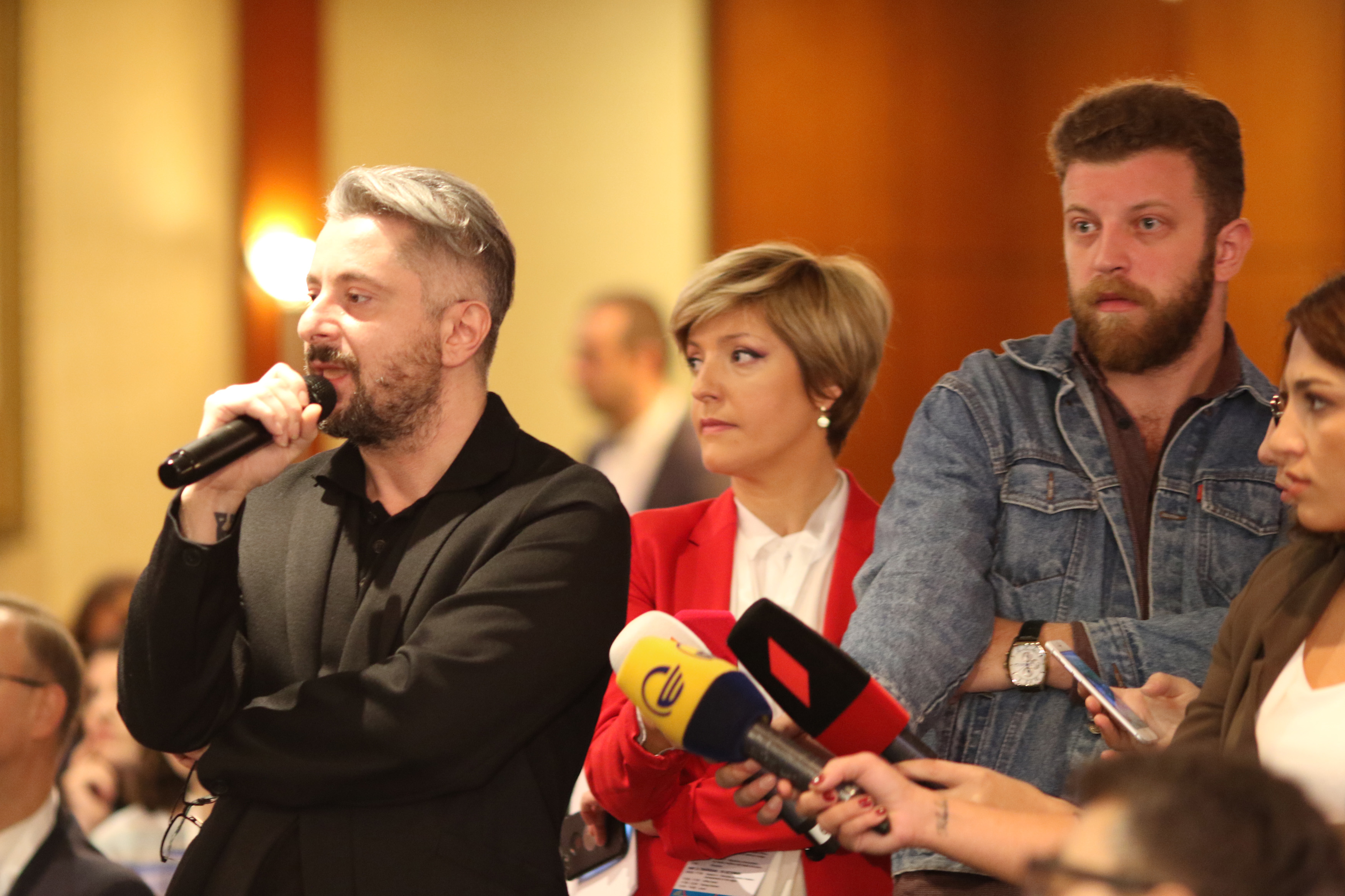 Nika Gvaramia (l) asking a question during the 16th South Caucasus Media Conference, Tbilisi, 9 October 2019.
