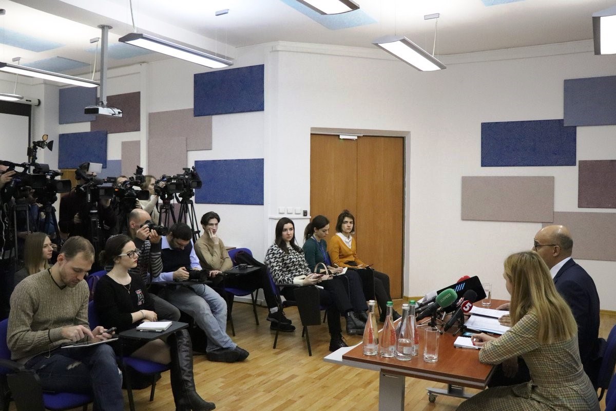 OSCE Representative on Freedom of the Media Harlem Désir answers questions from journalists during a visit to Kyiv, Ukraine, 6 February 2020.