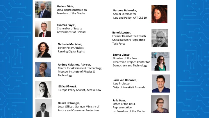 Speakers of the event on "The rise of artificial intelligence and how it will reshape the future of free speech", organized by the OSCE Representative on Freedom of the Media, 8 July 2020.